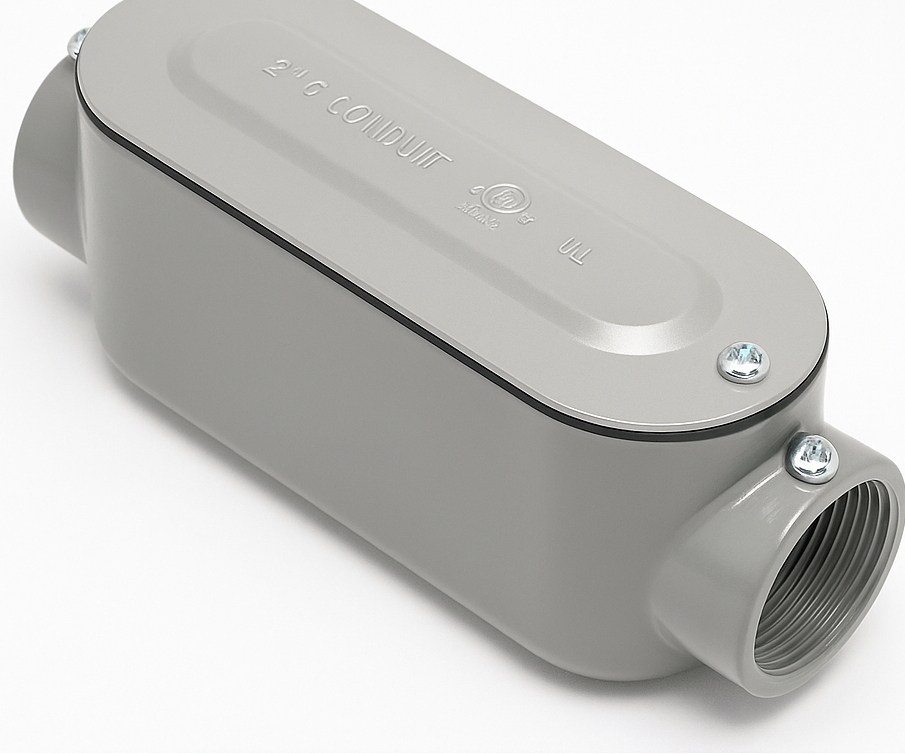 The 2" Set Screw & Threaded Conduit C body is designed to provide a convenient pulling point, directional change, and access for splicing conductors in conduit runs. Built from heavy-duty die-cast aluminum alloy with a gray enamel finish, this conduit body ensures long-lasting durability and excellent corrosion resistance for both indoor and outdoor installations.